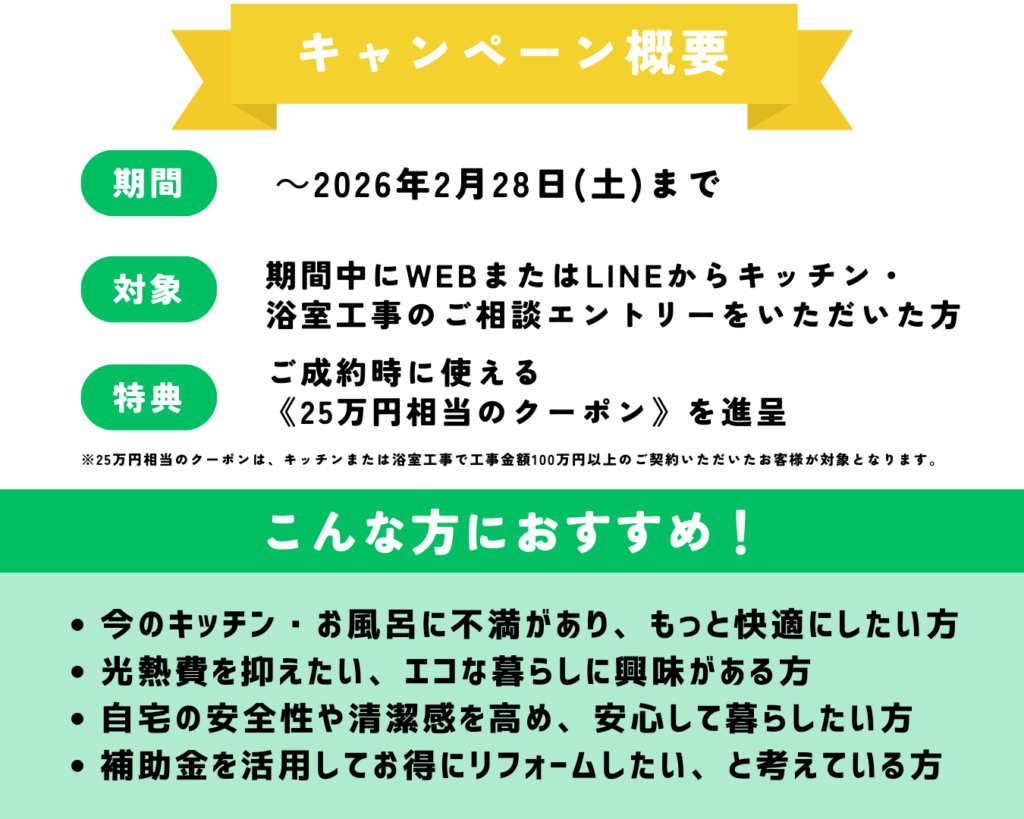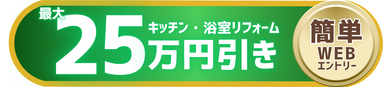 キッチンやお風呂のリフォームなら今がチャンス!WEBもしくはLINEからのご相談で、最大25万円の割引クーポンを進呈いたします。工事内容によっては補助金が利用できる可能性もあります♪どうぞお気軽にご相談下さい!