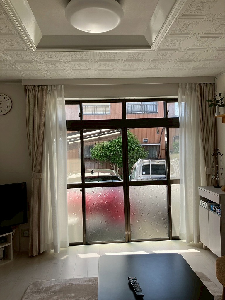 施工前はカーテンで目隠しをしていましたが、フィルムを貼ることでカーテン無しでも中の様子は分かりません。