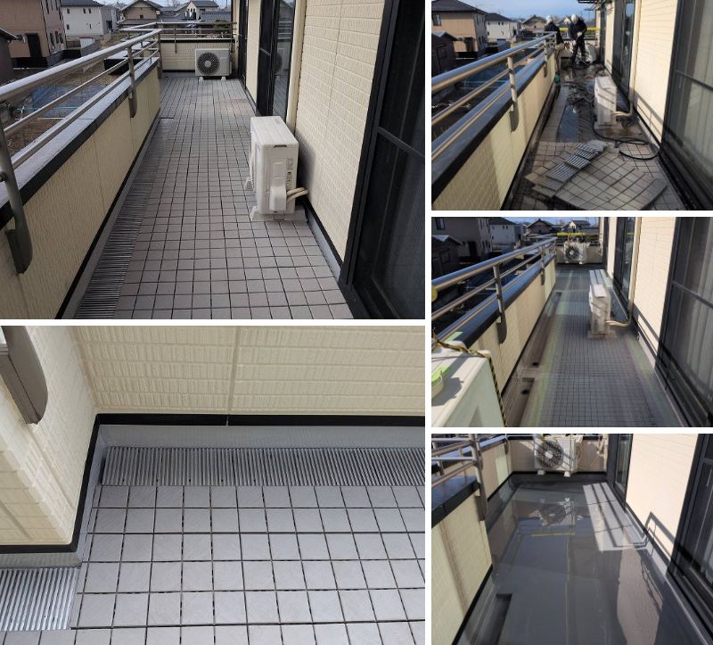 ベランダ防水工事を行いました。高強度ウレタン塗膜防水 通気緩衝工法(18㎡)です。洗浄・通気緩衝シート張り・ウレタン防水材2回塗布・歩行板戻し等を施工しています。