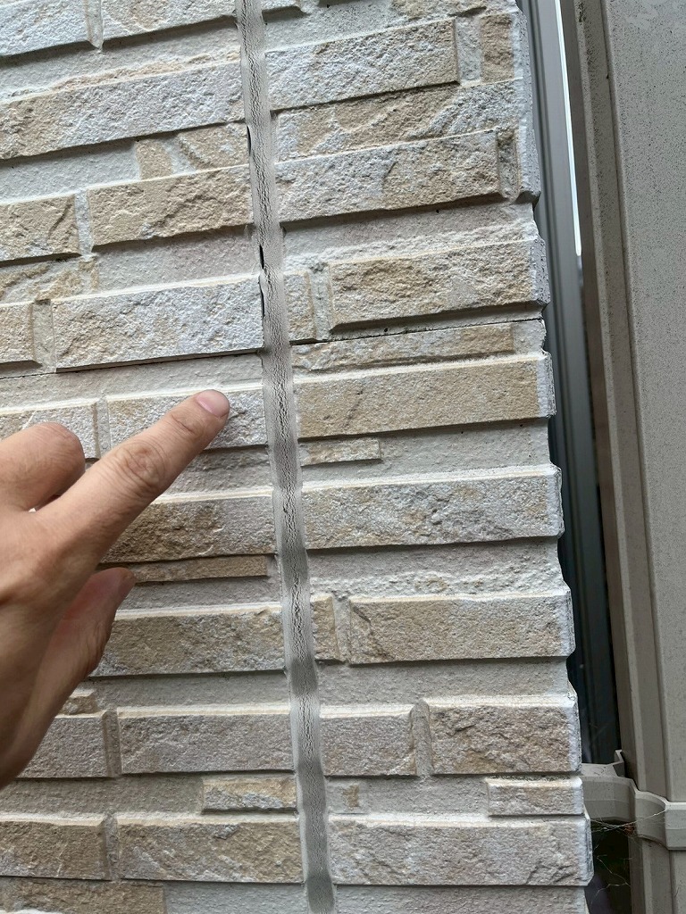 外壁の目地部分のシーリングが劣化して、硬くなったりひび割れたりしています。このままでは目地部分から雨水が侵入してしまいますので、古いシーリングは撤去して新しく打ち替える必要があります。
