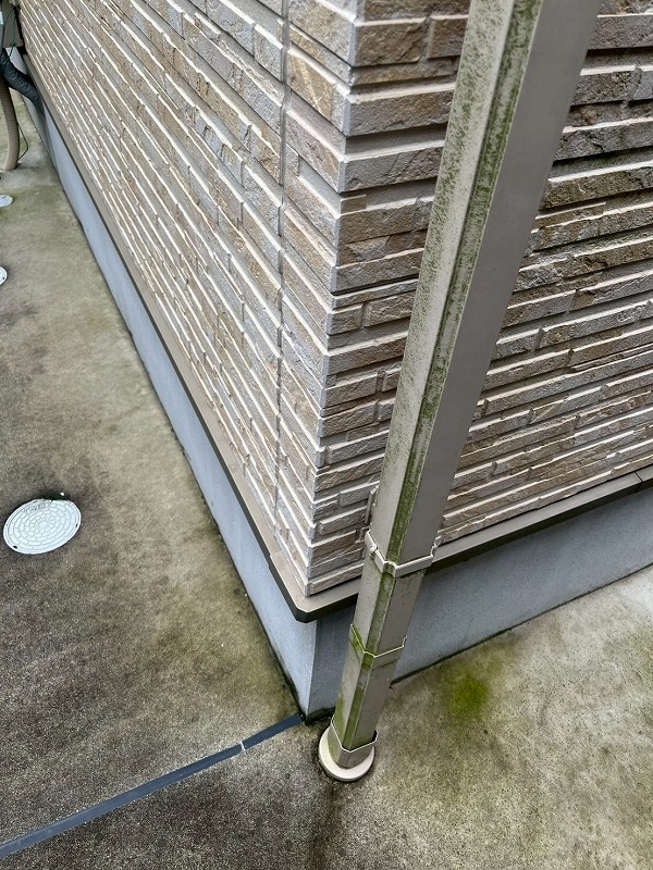土間と竪樋にコケが発生しています。外壁同様バイオ洗浄にて汚れを十分に落としていきます。