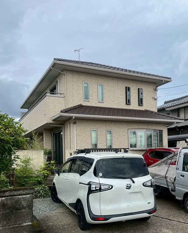 築14年、新築工事はタマホーム(株)様のお家です。ベージュのタイル仕様のおしゃれな外壁です。