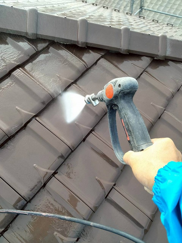 屋根の洗浄です。瓦屋根は耐久性が高く、コケ等による腐食を起こりにくい素材です。基本的に塗装の必要はありません。洗浄のみしていきます。