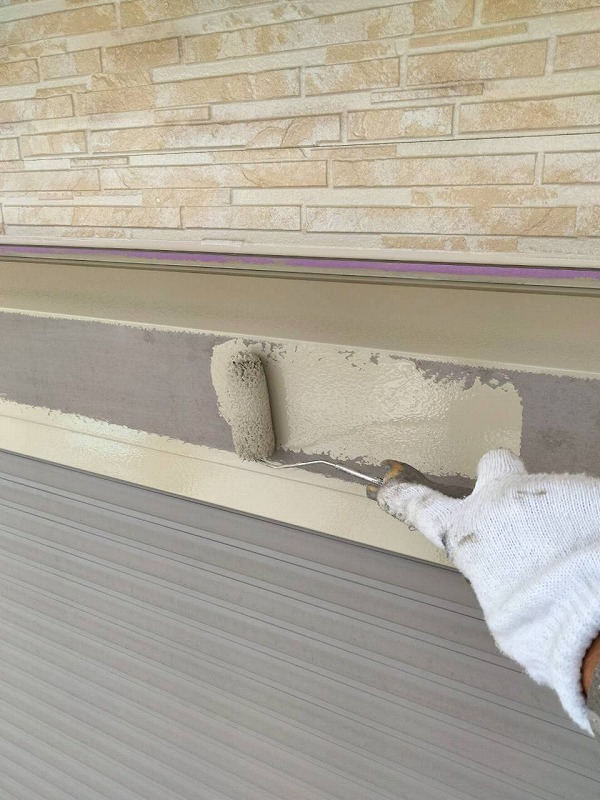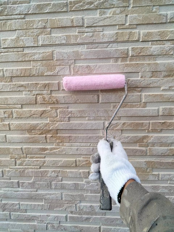 外壁上塗りです。今回の塗料は、スーパームキコートクリヤーです。透明なので外壁のデザインをそのままに美観を蘇らせることができます。