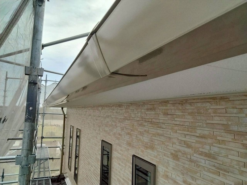 雨樋などの付帯部は、スーパームキコートルーフ【J25-60D】で塗装しました。外壁の色に合うベージュ系の色で、スーパームキコートの光沢感も感じられます。
