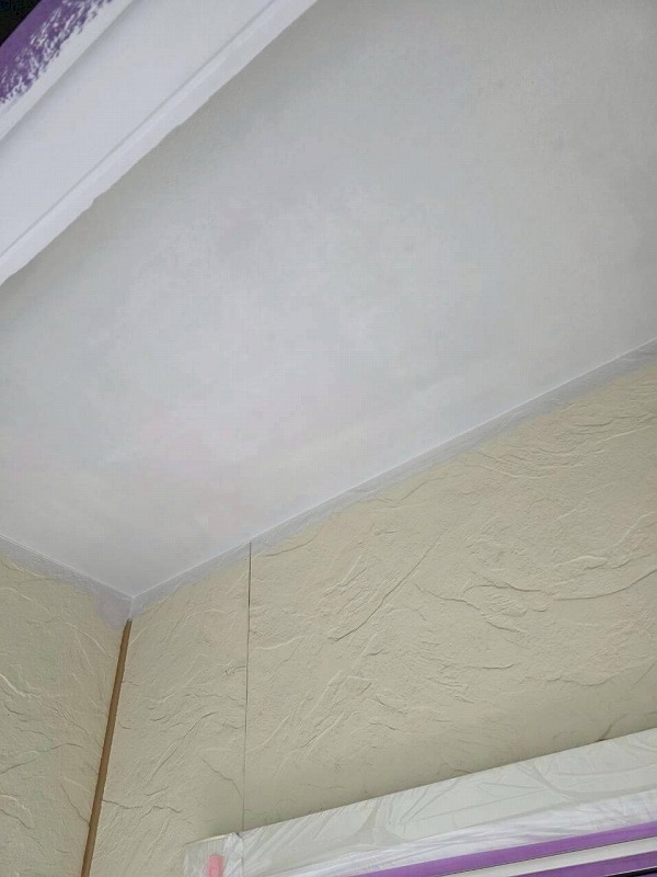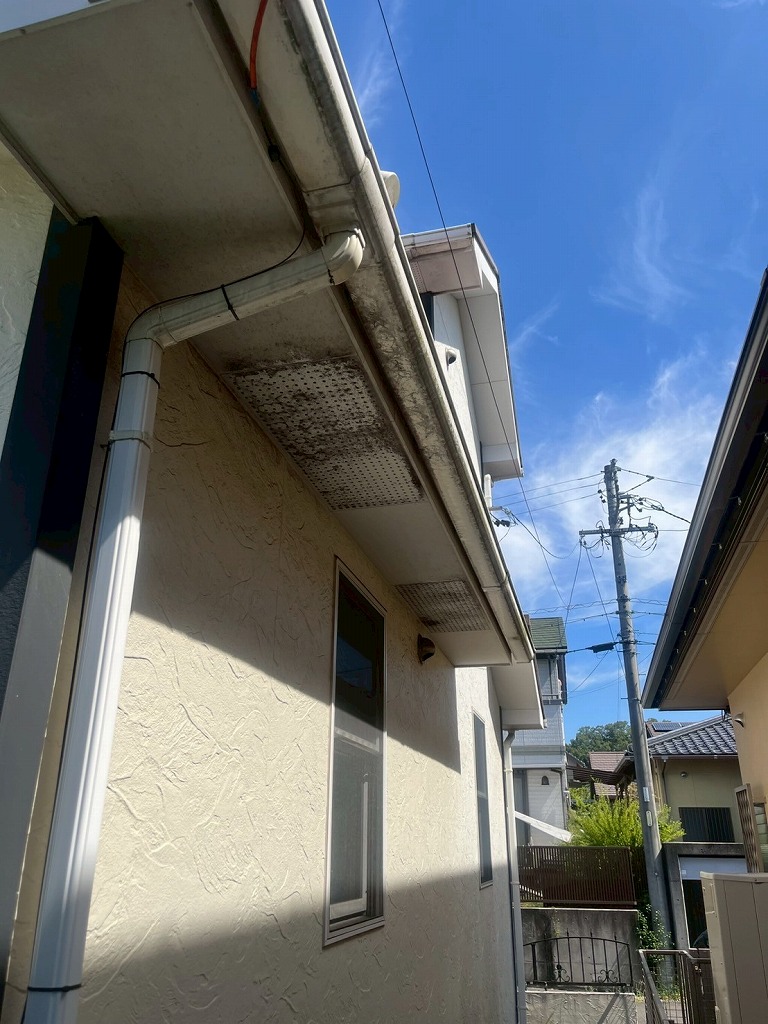 軒天に大きな劣化はありませんが、表面に汚れが見られました。劣化すると湿気を含みやすい状態になりますので、洗浄で汚れを落としてから塗装して、保護しておくことをおすすめします。