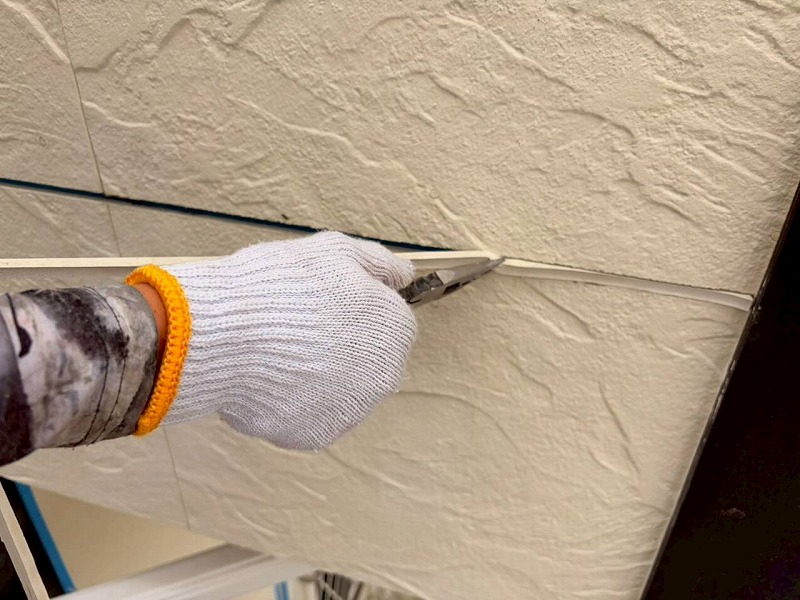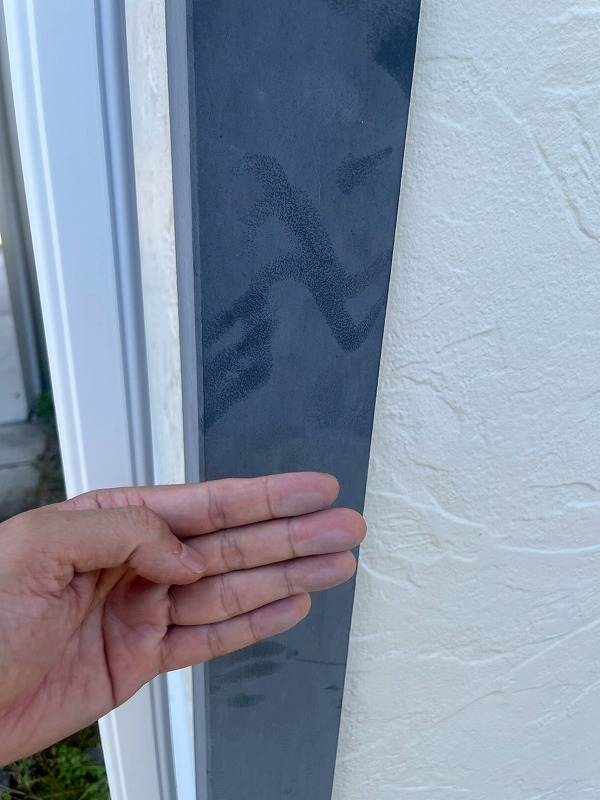 外壁を触ると手に白い粉が付くチョーキング現象が確認できます。防水効果が失われているサインですので、塗装してもう一度塗膜を復活させる必要があります。