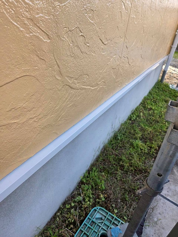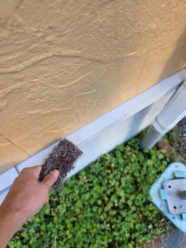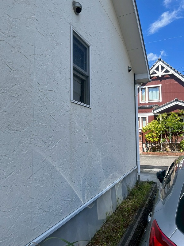 外壁にはチョーキングや雨筋などの汚れが見られました。チョーキングは防水効果が失われているサインです。