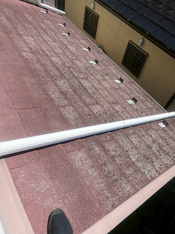 屋根はスレート瓦(カラーベスト)でした。塗装による定期的なメンテナンスが必要な素材です。また、汚れや色あせが見られました。屋根材表面の塗膜が劣化して湿気を含みやすい状態です。