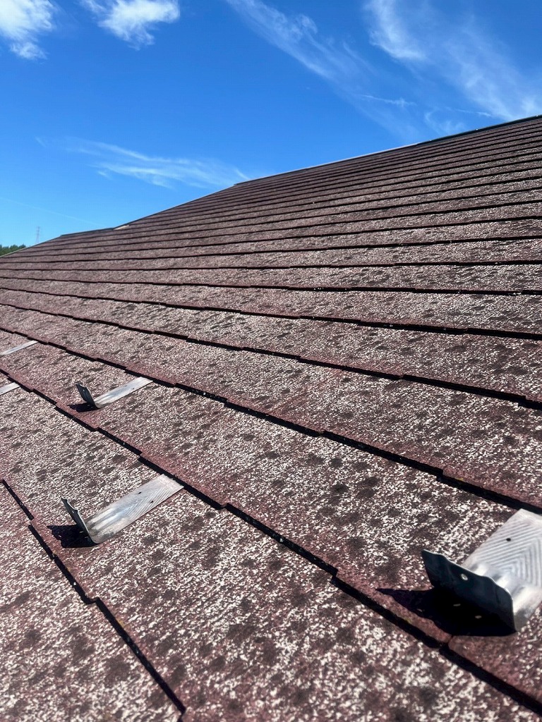 全体的に色褪せが進んでいます。屋根材表面の塗膜が劣化して湿気を含みやすい状態です。