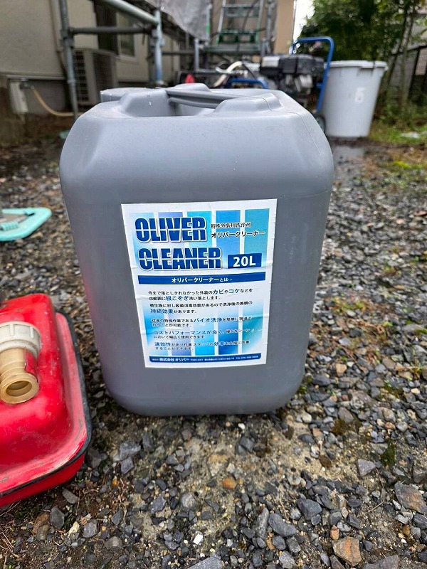 洗浄です。外装用バイオ高圧洗浄液オリバークリーナーを希釈して高圧洗浄します。カビは根があるので水洗いだけでは落ちません。