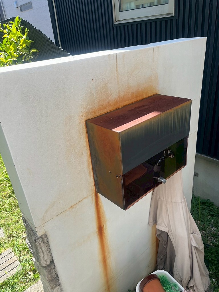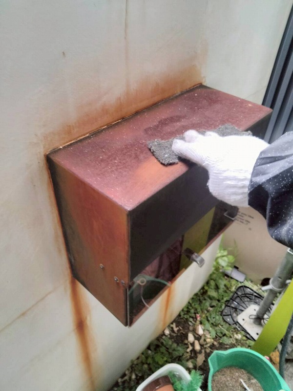 ポストと外塀の塗装です。ポストは先にケレンします。