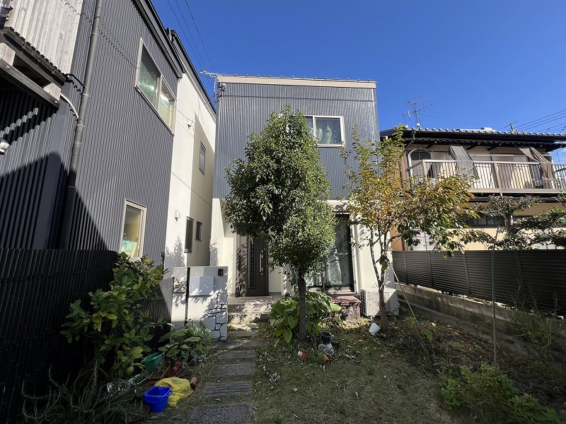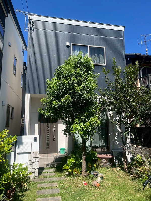 外壁はスーパームキコートベージュ系【JC-04】とグレー系【JC-29】、付帯部は、ムキルーフ【19-60C】で塗装しました。外塀は、ガイナスーパークリーン【22-85b】で塗装しました。