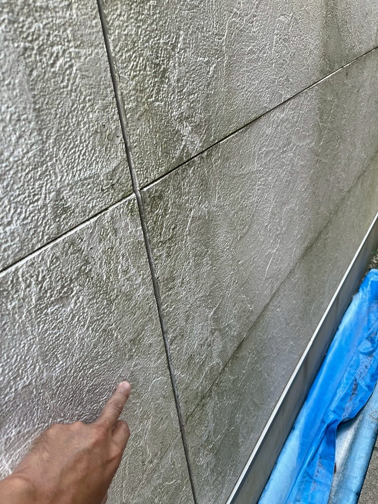 外壁を触ると手に白い粉が付くチョーキング現象が確認できます。防水効果が失われているサインですので、塗装してもう一度塗膜を復活させる必要があります。