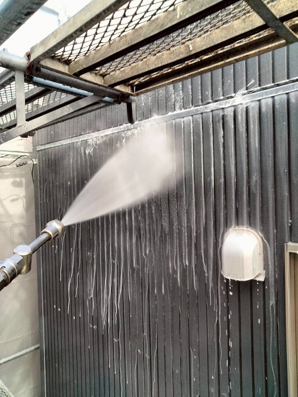 外壁の洗浄です。塗装前の洗浄は、新しい塗料がしっかりと密着するようにするため、また、カビや苔が再発するのを防ぎ、塗膜の早期剥がれを防ぐために行います。