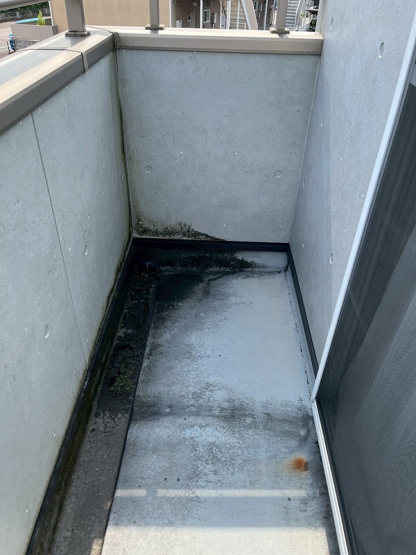 ベランダです。汚れやコケが見られます。洗浄できれいにしてから塗装します。