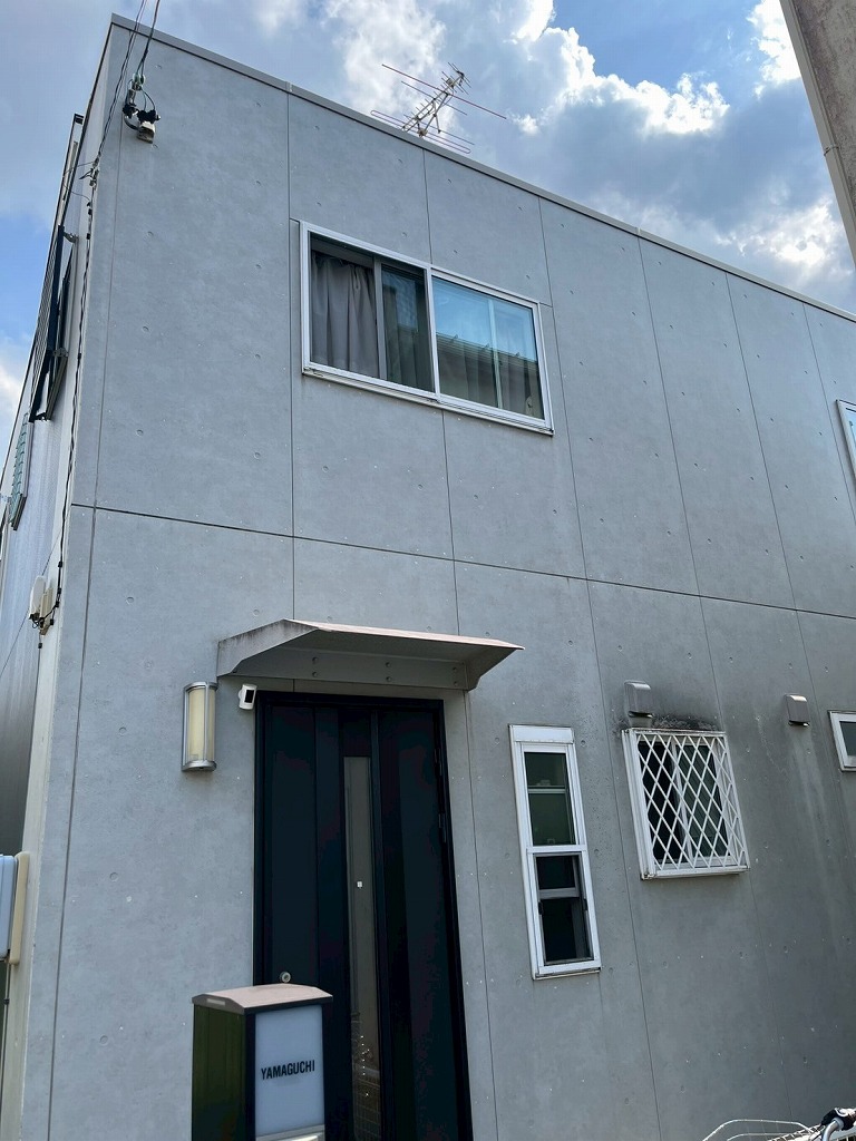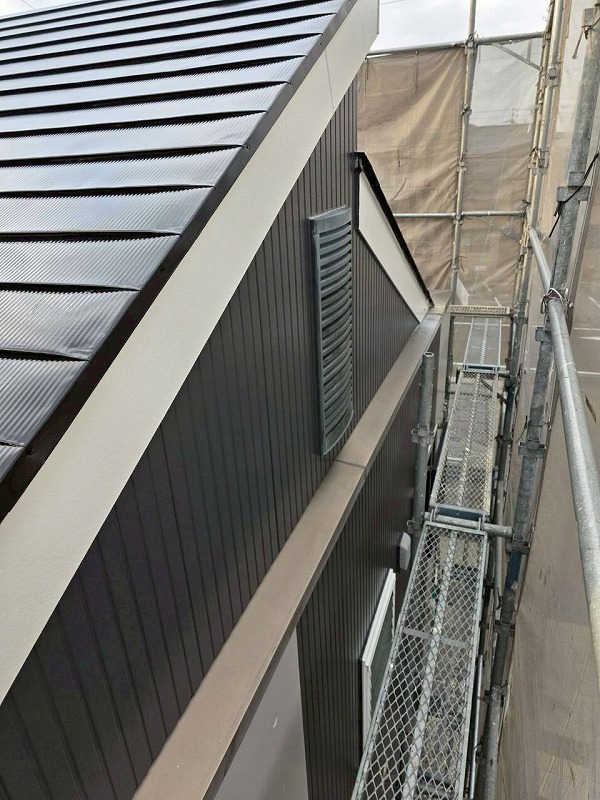 外壁は、スーパームキコートで塗装しました。色は、グレー部分が【JC-21】、黒色部分が【JC-29】です。屋根はスーパームキコートルーフの【JN-10】、付帯部はフタイムキコートで塗装しました。全てスーパームキコートのツヤ感・光沢感の感じられる仕上がりとなっています。