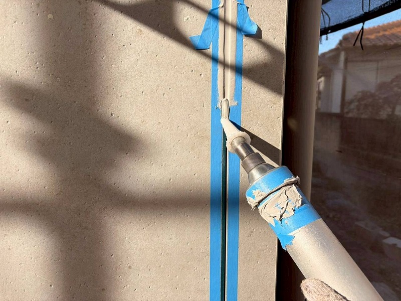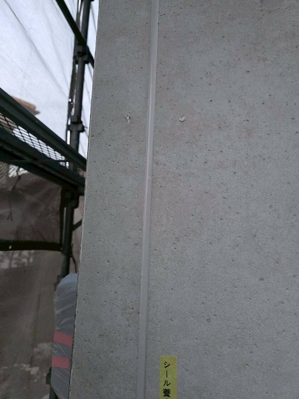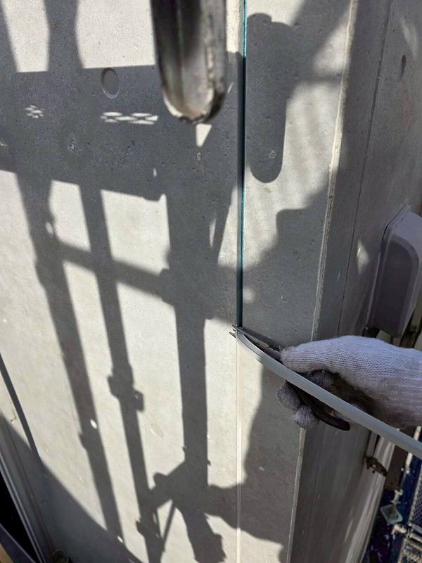 シーリング工事です。目地シーリングの劣化をそのままにしておくと目地部分から雨水が浸入してしまいます。古いシーリングは撤去して、新しく打替えます。