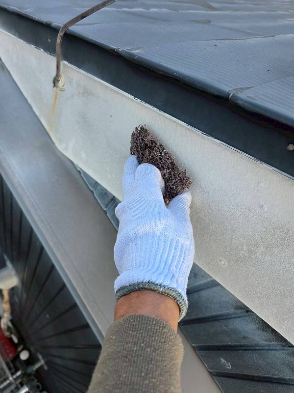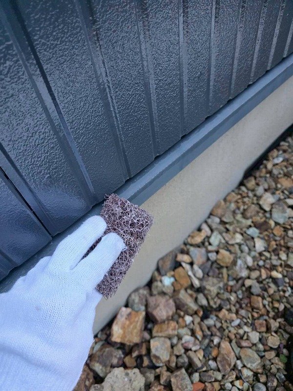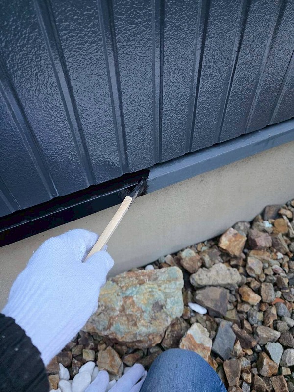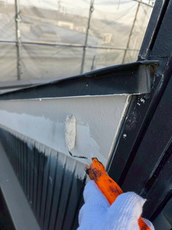 水切り(付帯部)塗装です。ケレン後フタイムキコートブラックで塗装します。