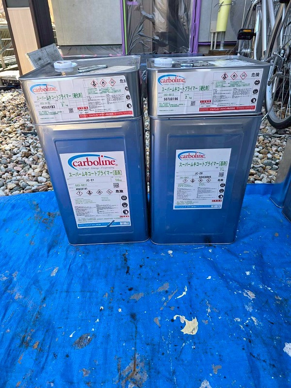 外壁塗装です。今回使用する塗料は、スーパームキコート【JC-21】と【JC-29】です。