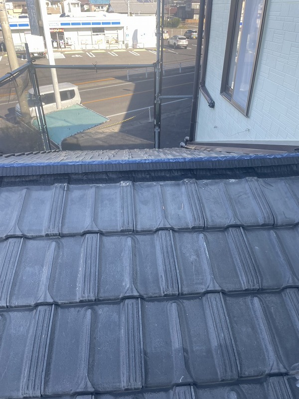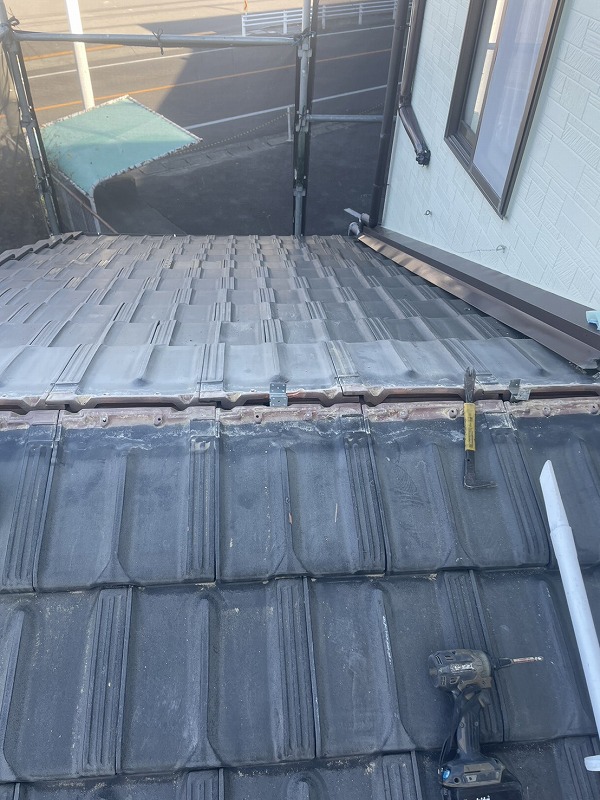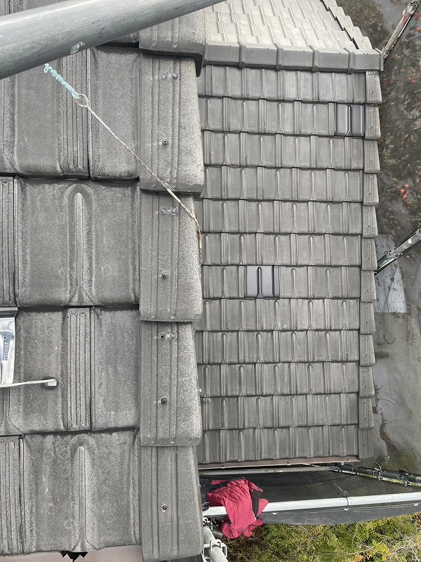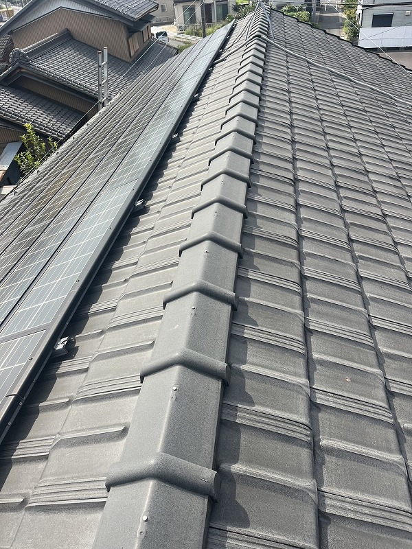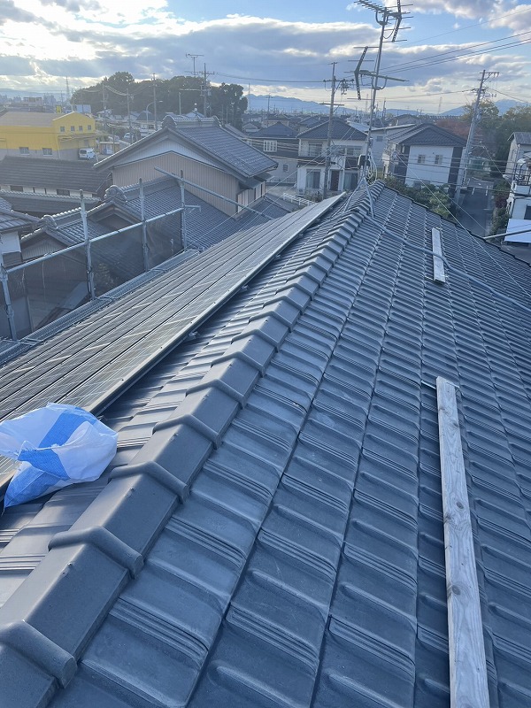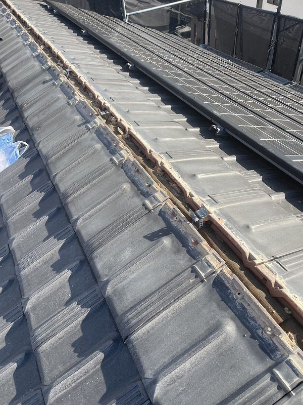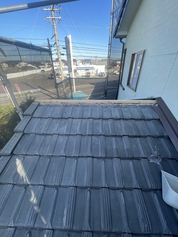 今回は、棟の工事はハイロール施工をさせていただきました。ハイロール施工では漆喰が不要のため、棟重量の大幅な軽量化が実現します。建物全体への負担が減り、地震時の揺れや建物への負荷が軽減され、耐震性が向上します。