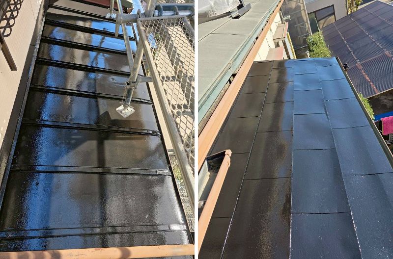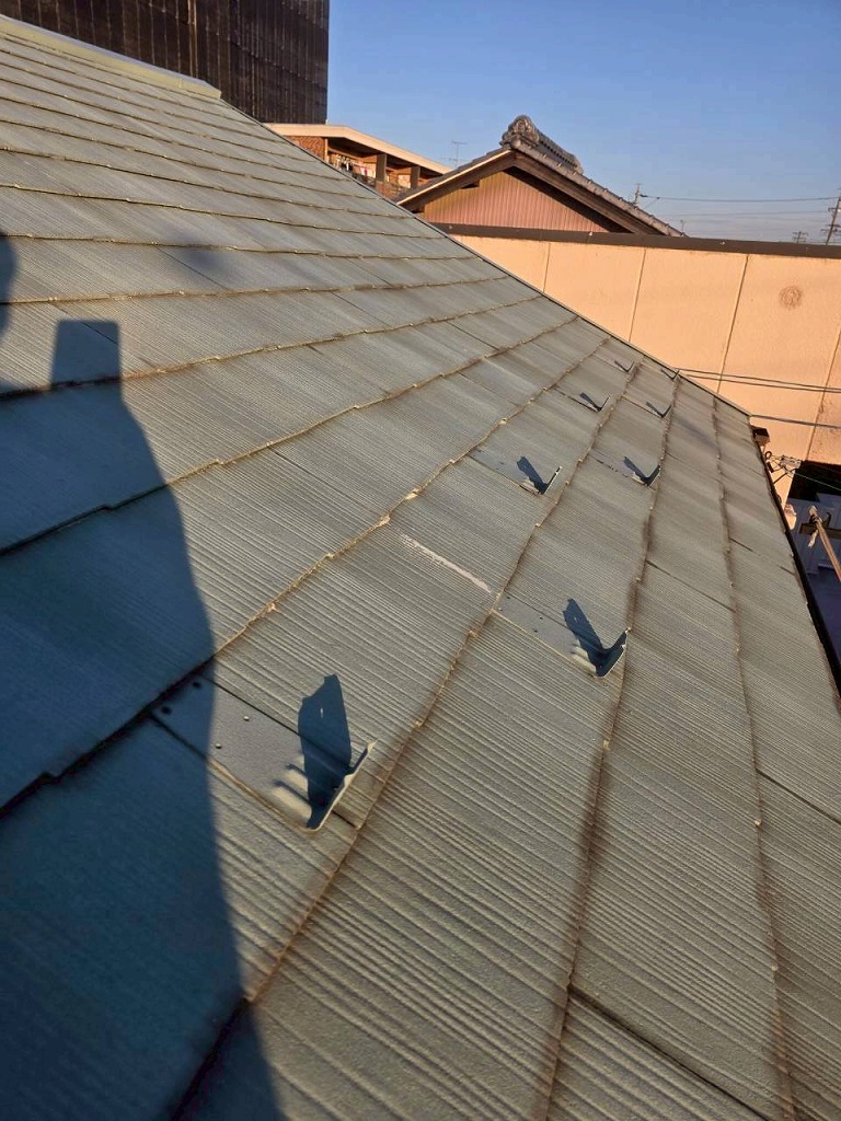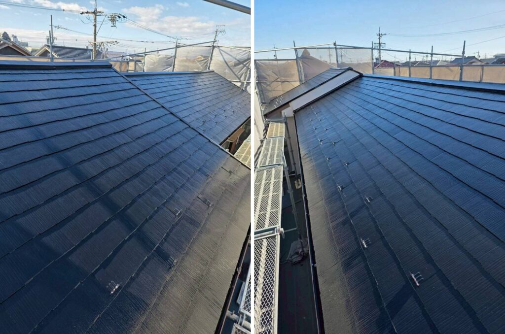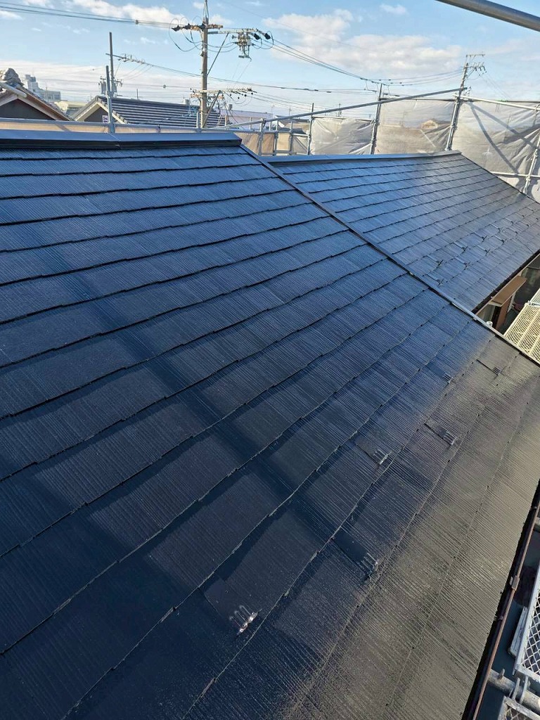 外壁2面(東西)と屋根の塗装を行いました。どちらもスーパームキコートシリーズで塗装させていただきました。スーパームキコートの特徴であるツヤ感のある仕上がりとなりました。