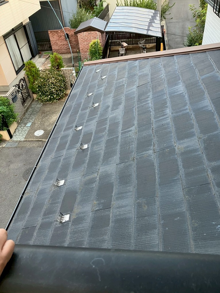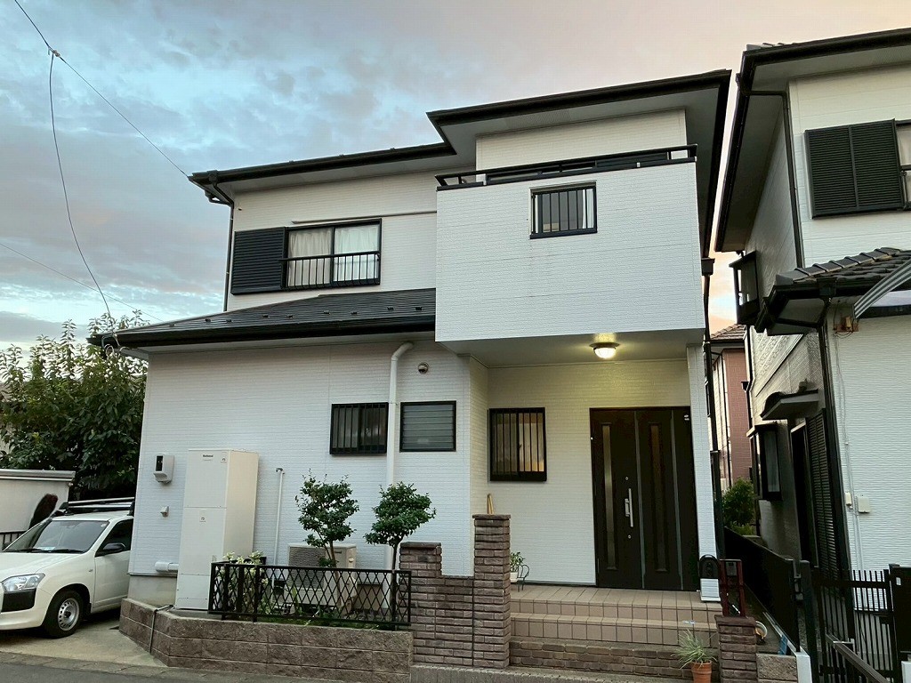築30年の白い外壁のお家です。屋根はスレート屋根でタスペーサーが設置されています。