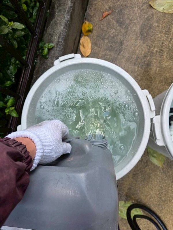 バイオ液を希釈して洗浄します。バイオ液は、外装用洗浄剤オリバークリーナーを使用しています。