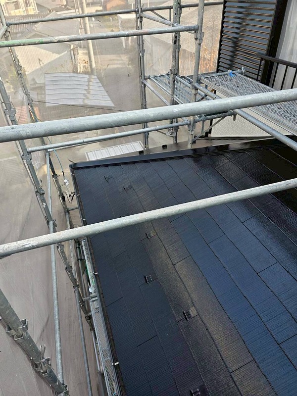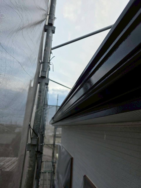 外壁塗装を行いました。外壁はスーパームキコート【JC-04】、屋根はスーパームキコートルーフ【JN-10】、付帯部はフタイムキコートブラックで塗装しました。