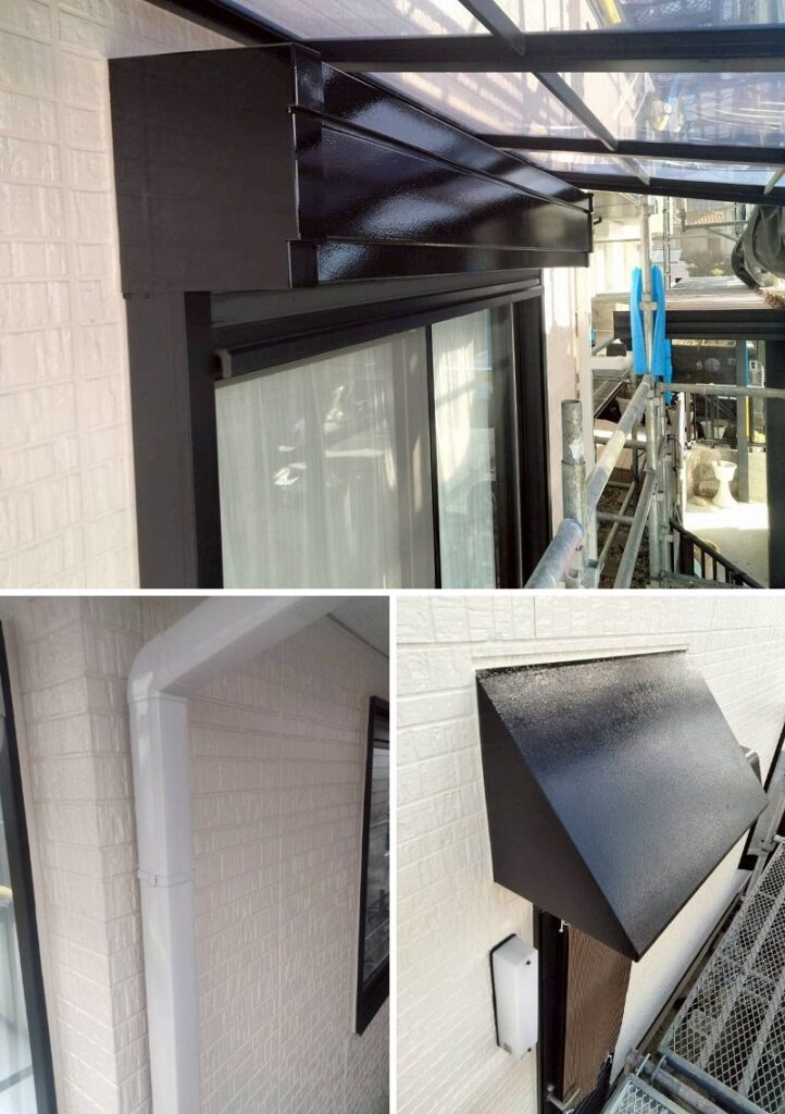 シャッターボックスや雨樋、庇などの付帯部を塗装しました。フタイムキコートのピカピカでツヤ感のある仕上がりとなりました。