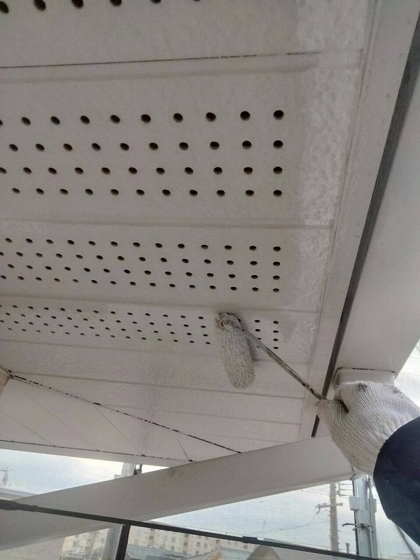 軒天の塗装です。軒裏の湿気を逃がすための通気口が設けられており、定期的に塗装でメンテナンスしておけば良い状態を保つことができます。透湿性に優れた水性通気塗料で塗装させていただきます。