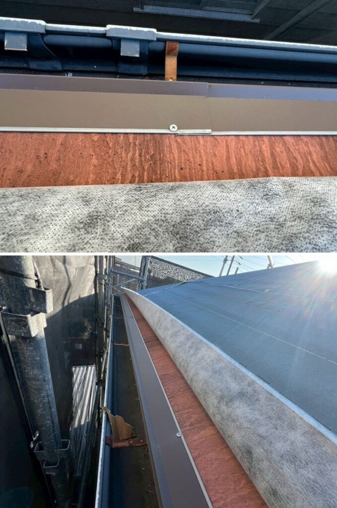 軒先やケラバ、谷部などに、雨水の浸入を防ぐための専用板金を取付けます。