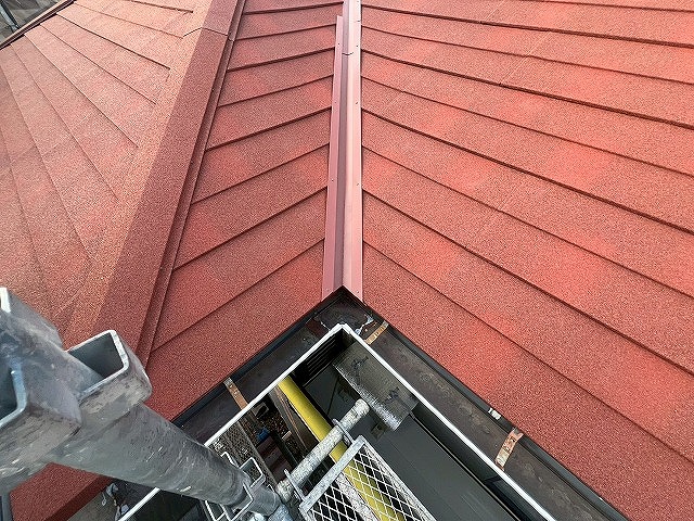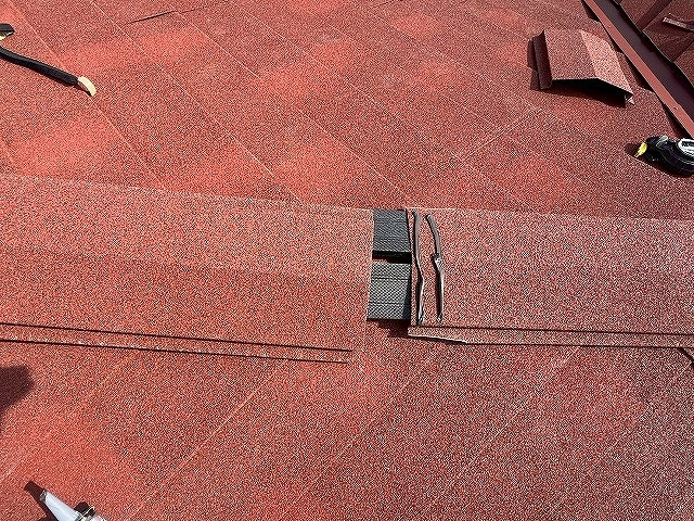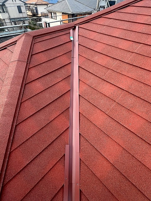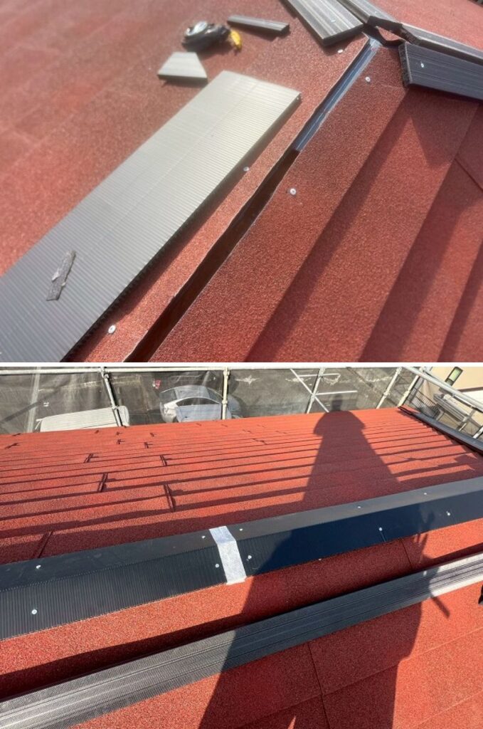 棟は換気棟を新設し、Jメタルルーフの棟用板金を取付けました。