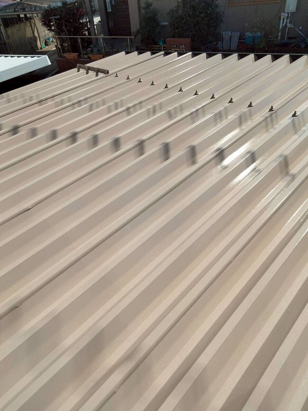 ガレージの折半屋根の塗装を行いました。スーパームキコートシリーズの屋根用塗料スーパームキコートルーフにて塗装しました。
