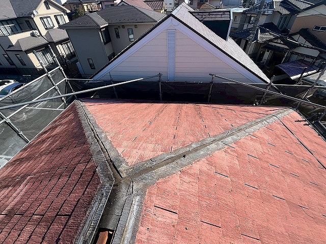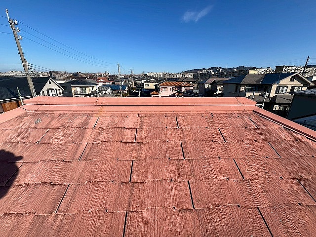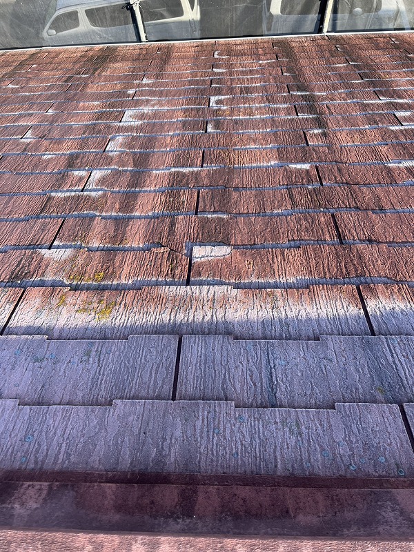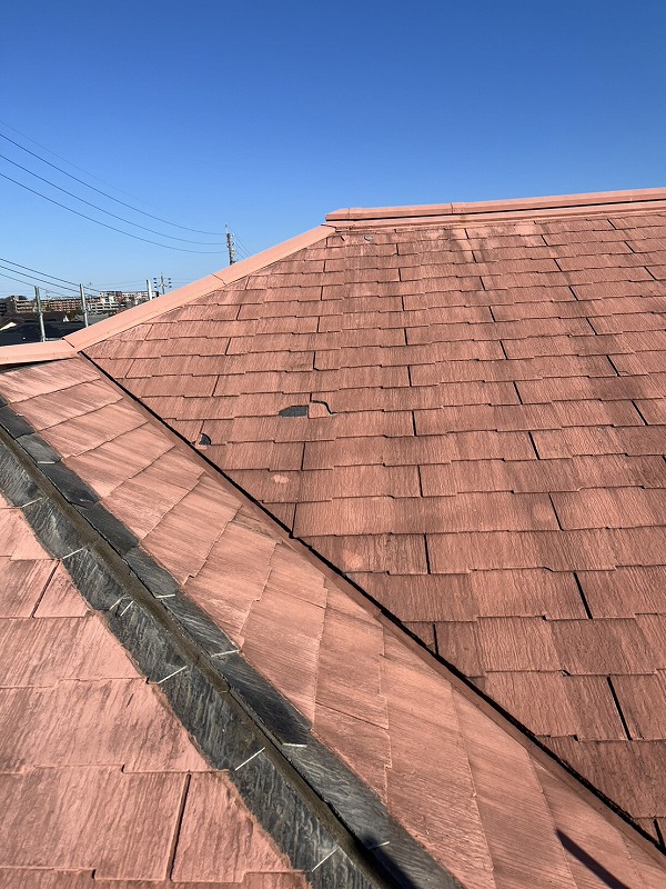 屋根はスレート屋根です。今回は石付板金Jメタルルーフにて板金施工させていただきます。