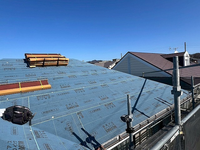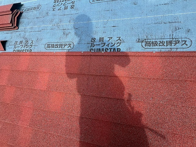 ルーフィングを敷設します。ゴムアスルーフィングを使います。