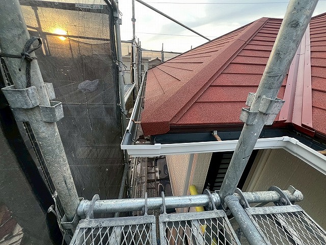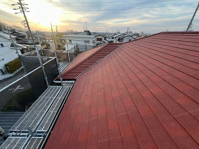屋根カバー工事を行いました。屋根カバー工法は、屋根塗装に比べて、耐久性・防水性・断熱性が向上するというメリットがあります。