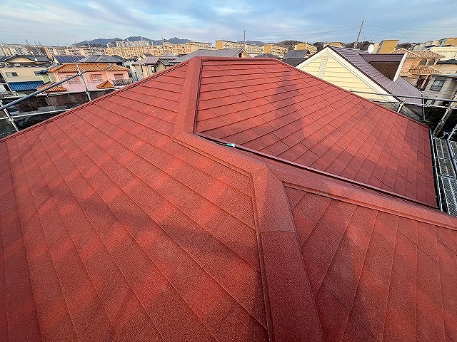 Jメタルルーフを使った屋根カバー工事を行いました。Jメタルルーフは、非常に軽量(瓦の約1/8)で耐震性に優れ、自然石粒コーティングにより防音性・耐久性が高い次世代の金属屋根材です。サビに強く、カバー工法に適しているため、既存屋根の葺き替えやリフォーム時の負担軽減、デザイン性を重視する住宅に最適な屋根材です。