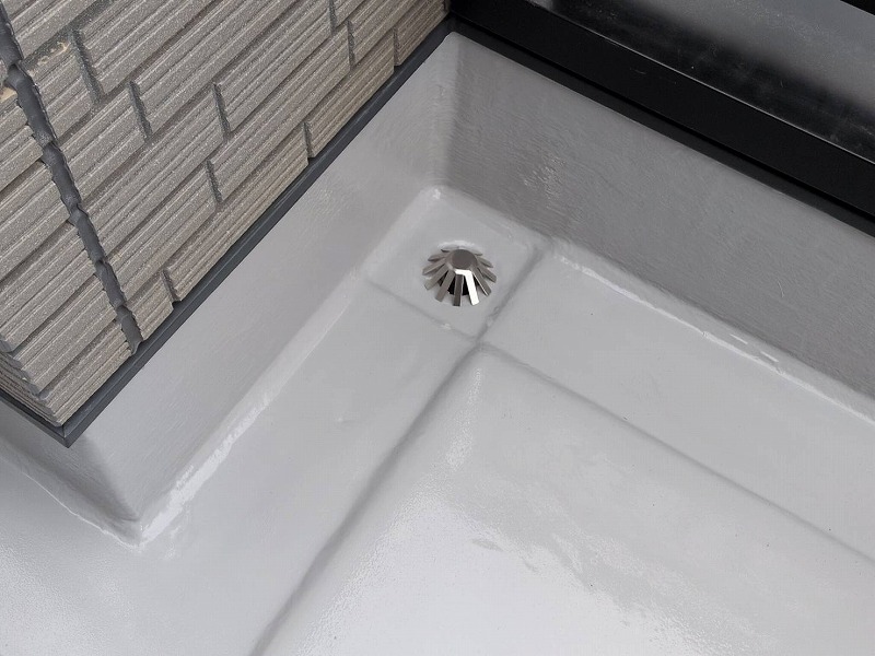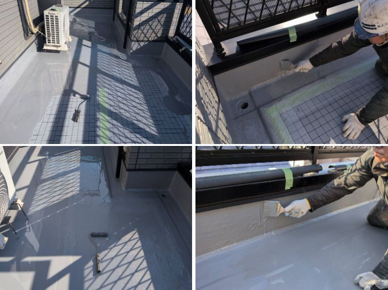 ウレタン塗膜防水 通気緩衝工法にて施工しました。この工法は、下地に含まれる水分による膨れを防ぎ、コンクリートのひび割れなどの影響を受けにくくするため、長寿命で耐久性の高い防水層が形成できます。