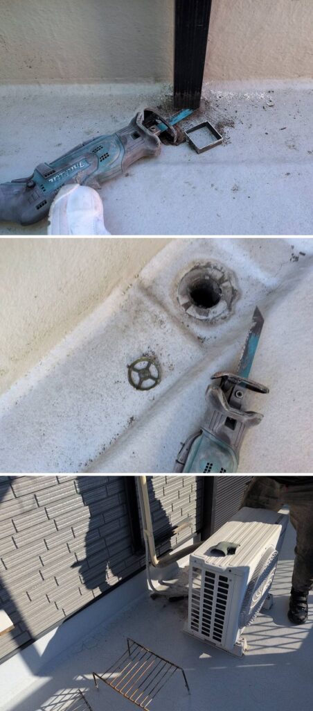 まずは、ベランダのホコリや汚れをしっかりと落とします。室外機は一時移動させていただきます。