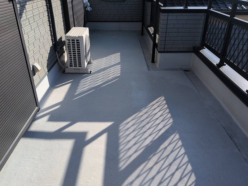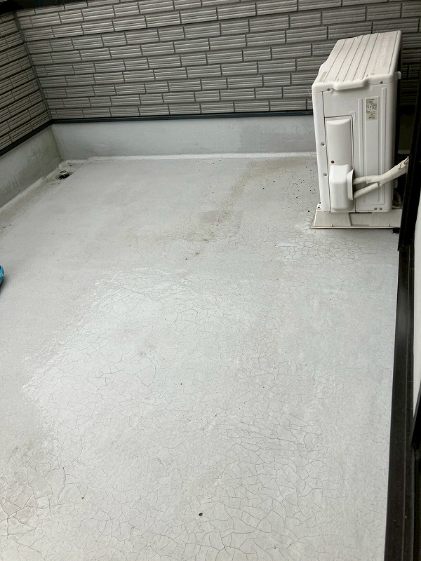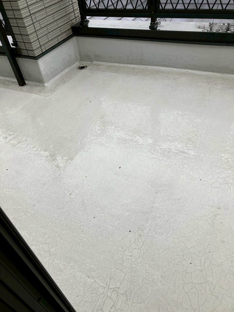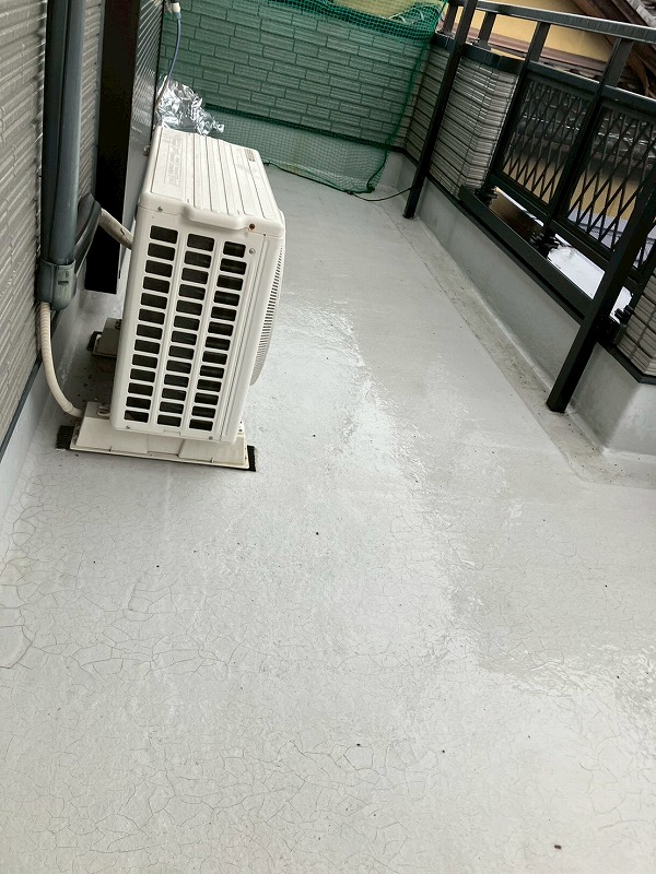 現地調査にてベランダ表面に膨れや割れなどが見られましたので、トップコートで保護するだけでなく、防水からやり直すことを提案させていただき施工させていただきました。