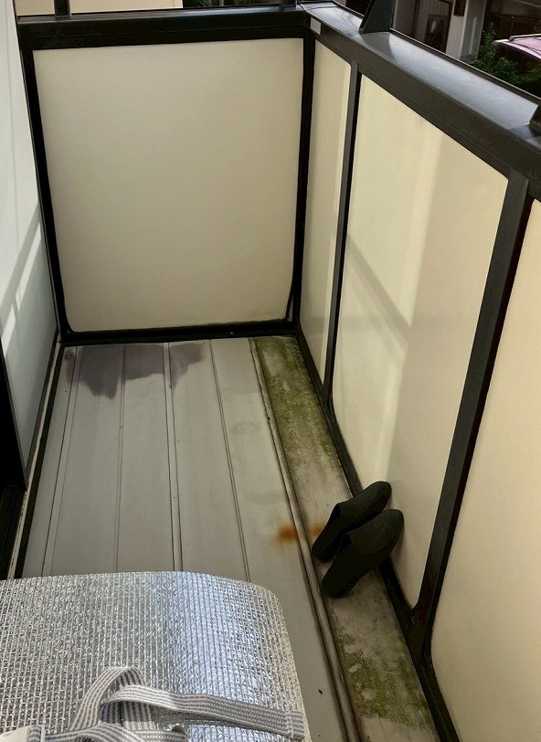 ベランダです。色あせやコケの発生が見られます。コケは根っこを深くはって劣化を早めてしまう原因になりますので、バイオ洗浄で洗浄し、綺麗な下地にすることが重要です。