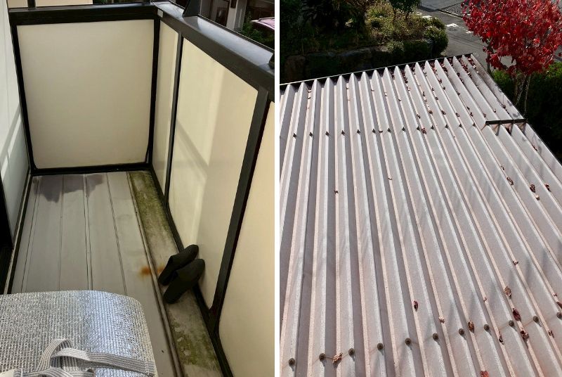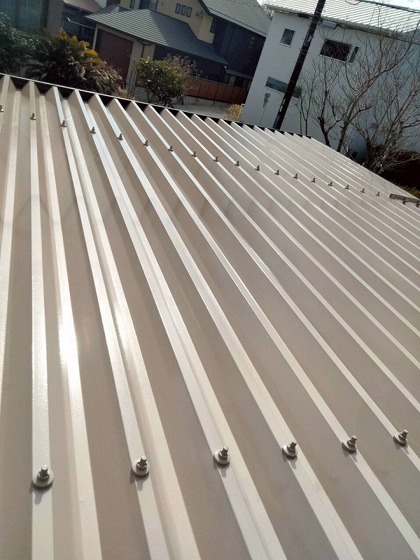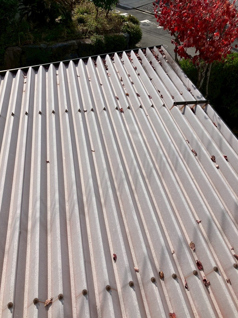 ガレージ屋根です。ボルトキャップが錆びて屋根に色移りしている部分があります。