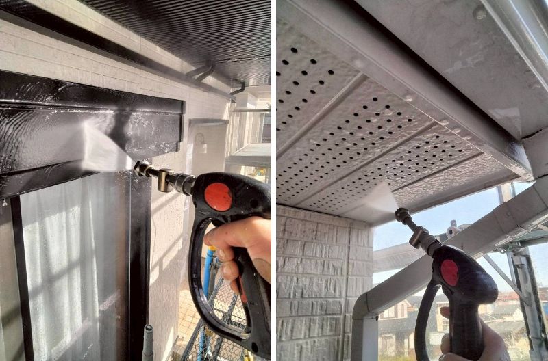 シャッターボックスや軒天など塗装する前に洗浄して汚れをしっかり落としていきます。