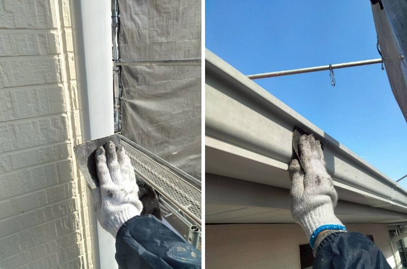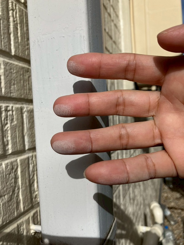 雨樋は触ると手に白い粉が付くチョーキング現象が確認できます。防水効果が失われているサインですので、塗装してもう一度塗膜を復活させる必要があります。