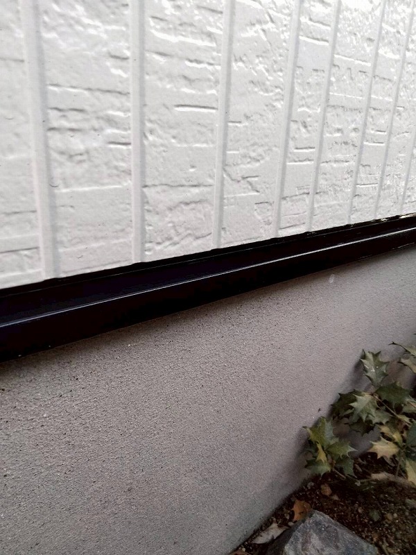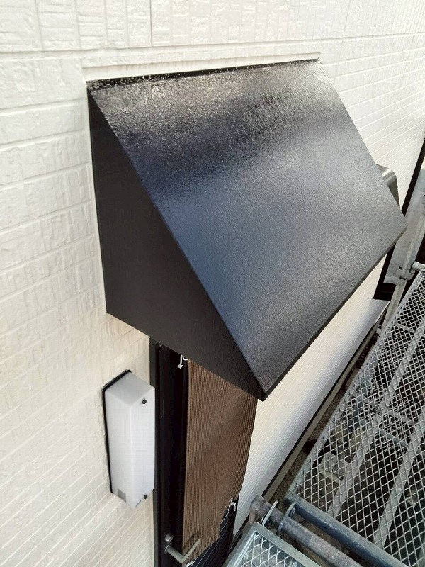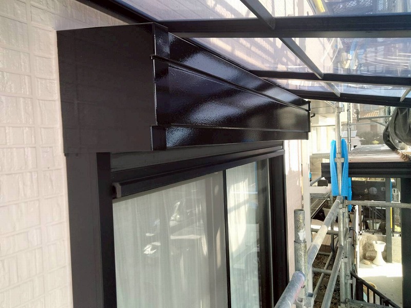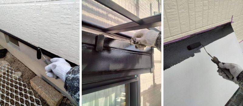 土台水切りやシャッターボックス、庇も塗装します。フタイムキコートブラックで塗装します。