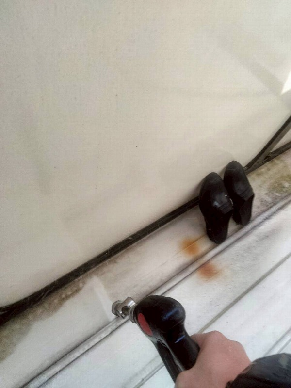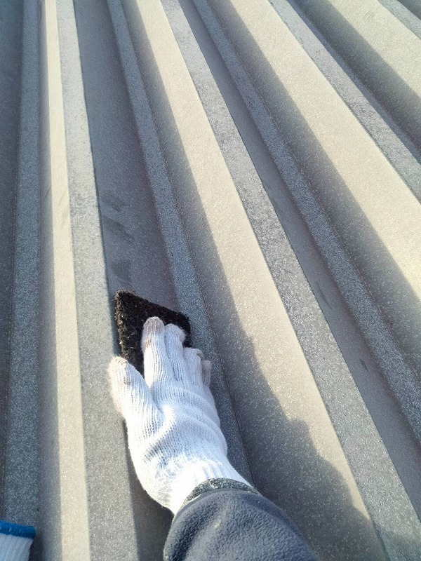 ガレージ折半屋根です。サビなどの汚れをしっかり落としていきます。