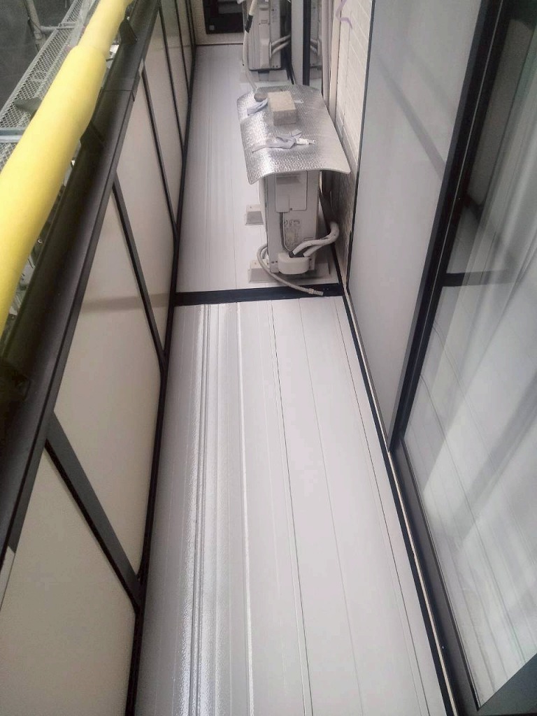 ベランダのデッキも塗装しました。フタイムキコート白で塗装しました。施工前は色あせやコケの発生などが見られましたが、ピカピカになりました。