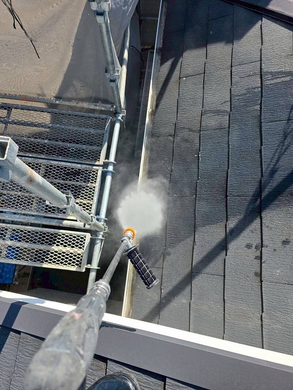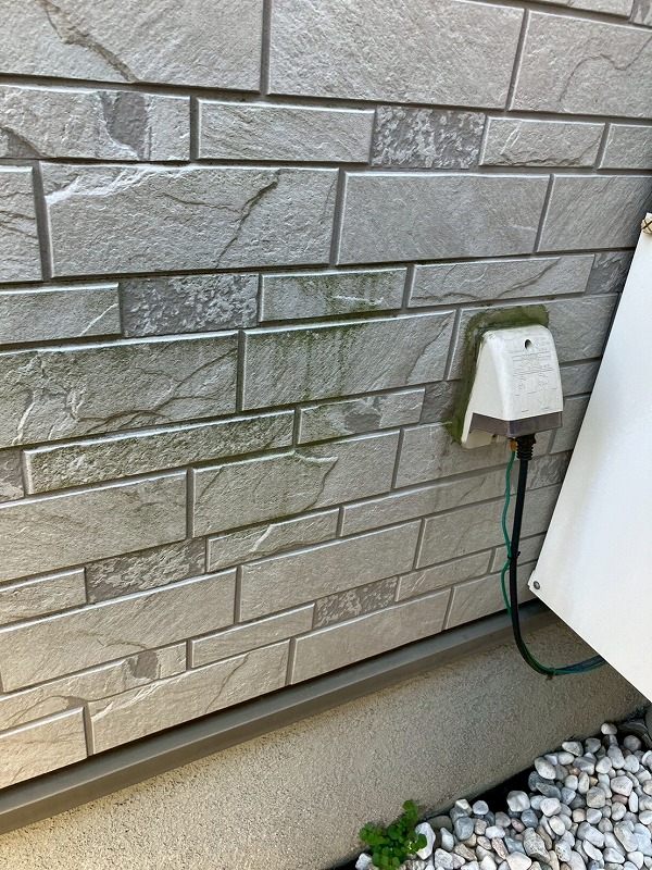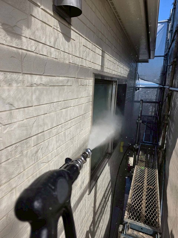外壁に発生していたコケなどは高圧洗浄にてしっかりと落としてから塗装します。