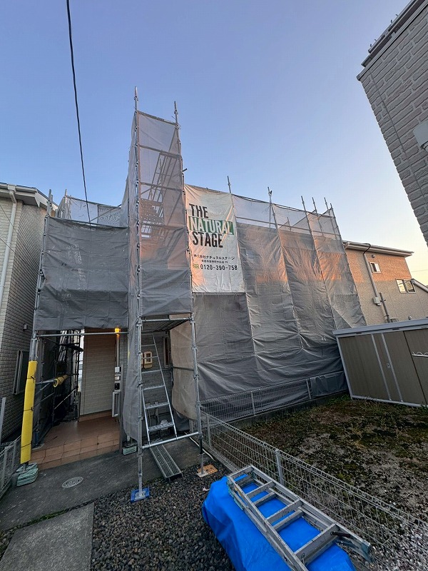 安全作業用足場設置工事:住宅用ビケ足場、東西南北4面、ネット養生含む